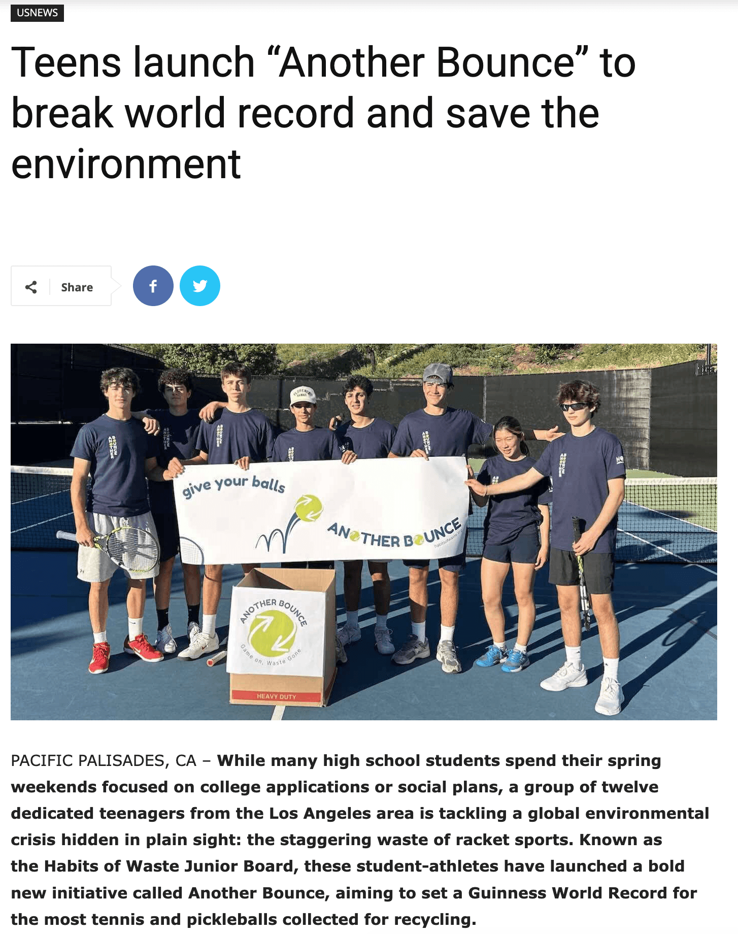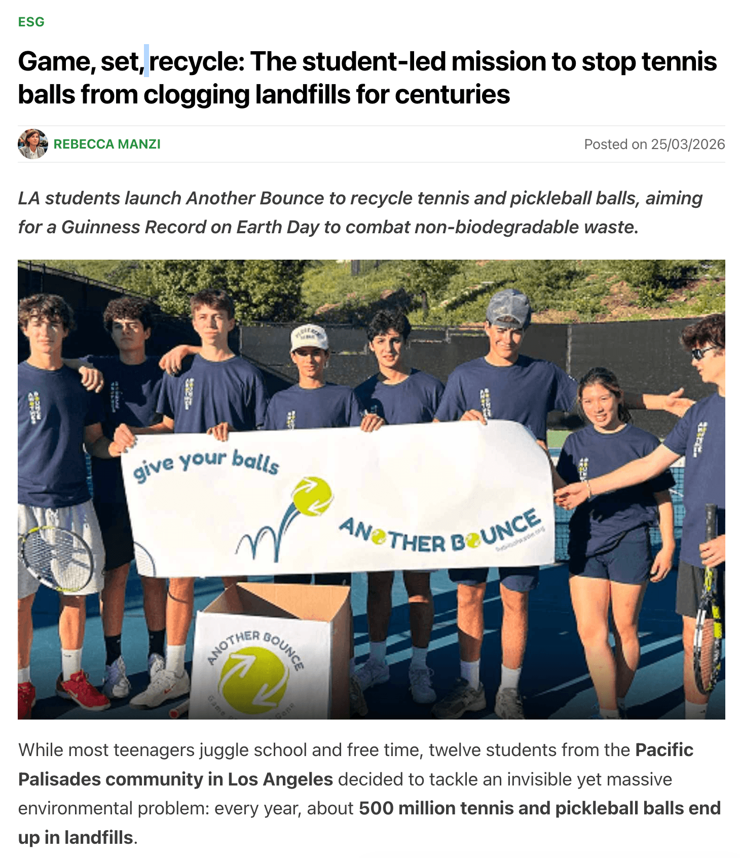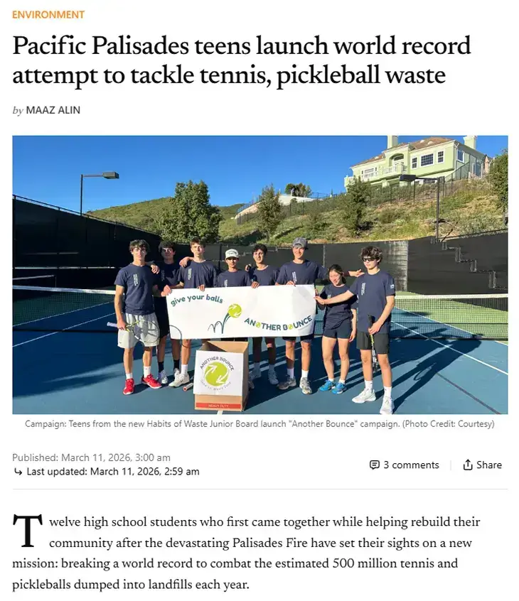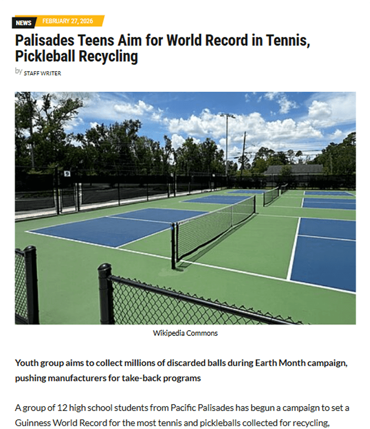 While most teenagers are focused on homework and weekend plans, twelve high school students from the Pacific Palisades community are confronting a global environmental issue hiding in plain sight: the estimated 500 million non-biodegradable tennis and pickleballs discarded into landfills each year.