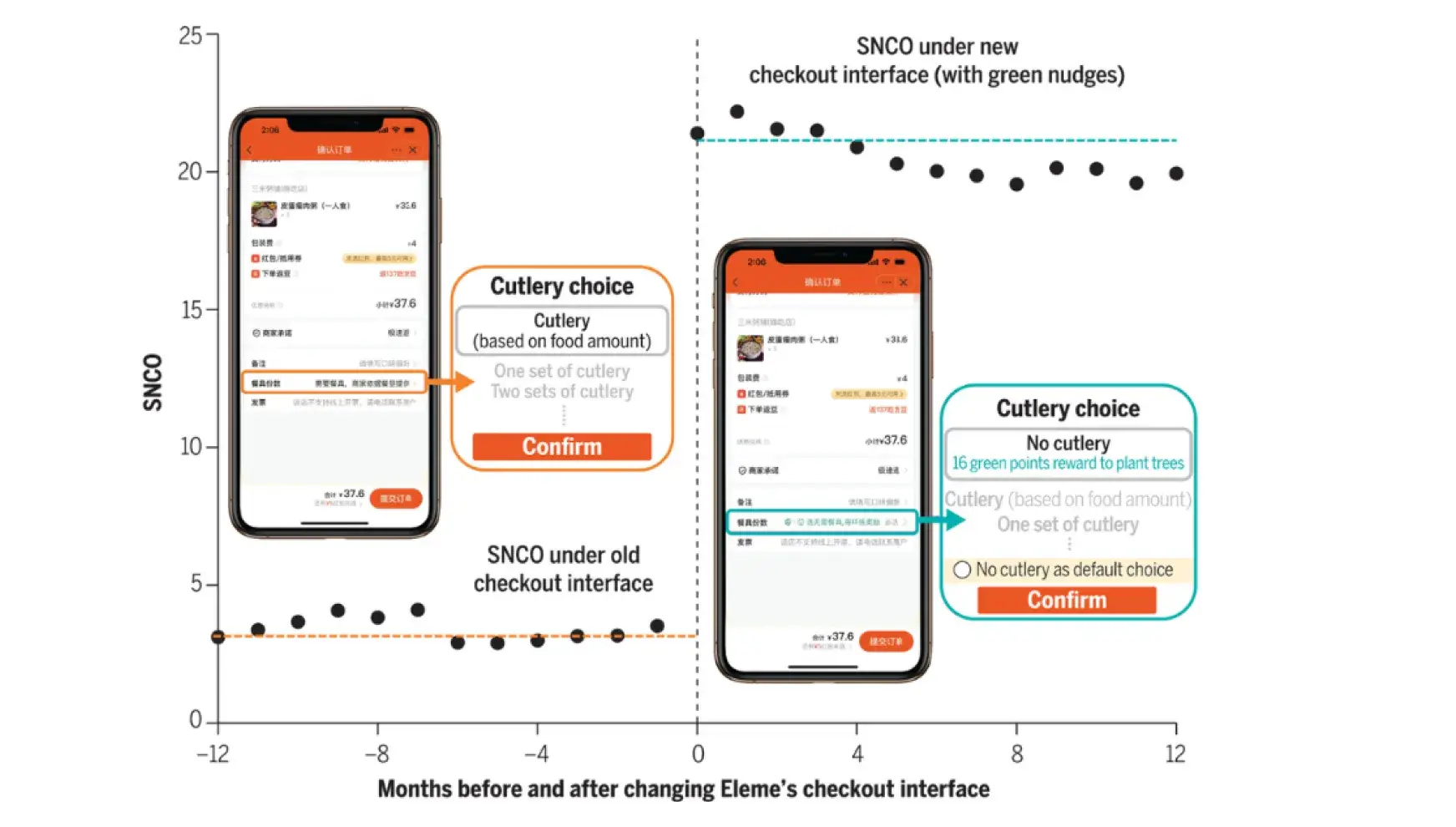 Research shows that “green nudges” in the form of choice architecture can drastically reduce waste. A 2023 study done in China found that the implementation of a “request only” option for plastic cutlery increased the share of no-cutlery orders by 648%.